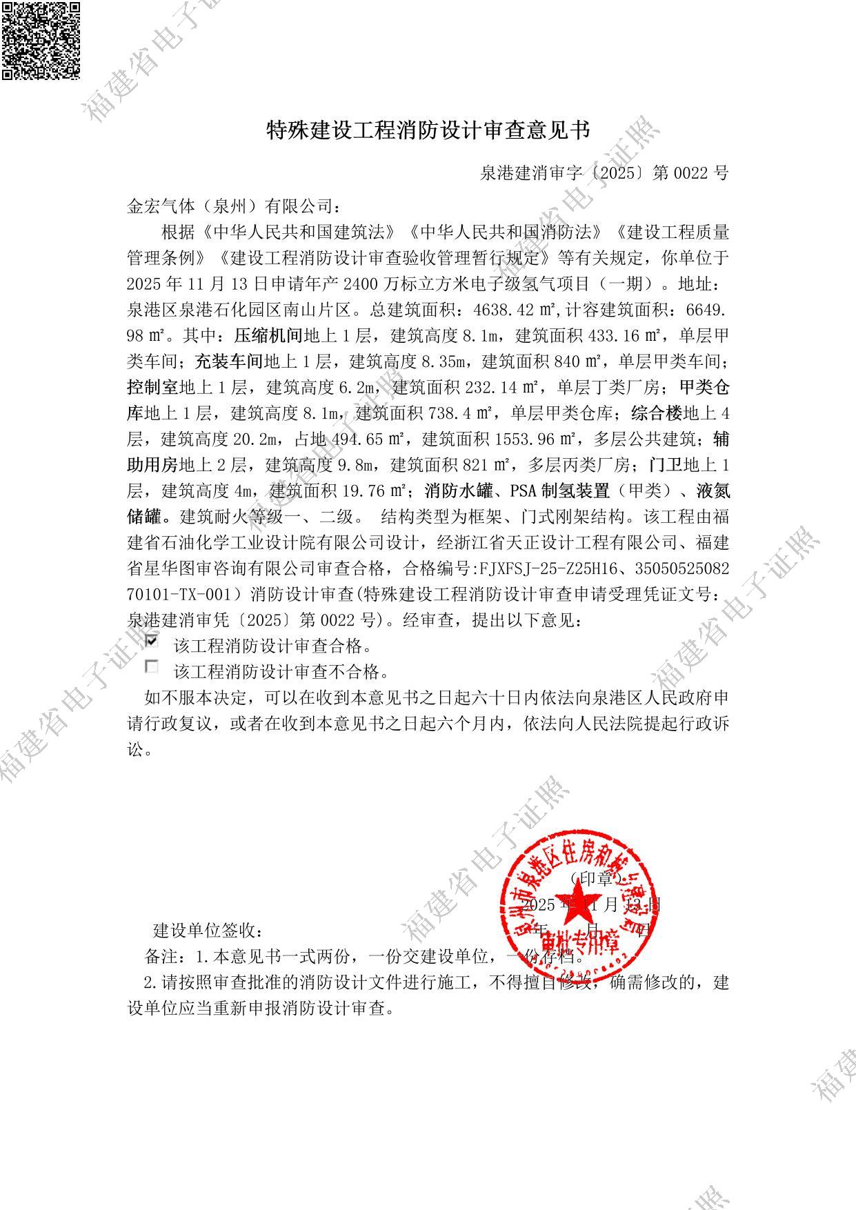金宏气体(泉州)有限公司年产2400万标立方米电子级氢气项目(一期)项目特殊建设工程消防设计审查意见书